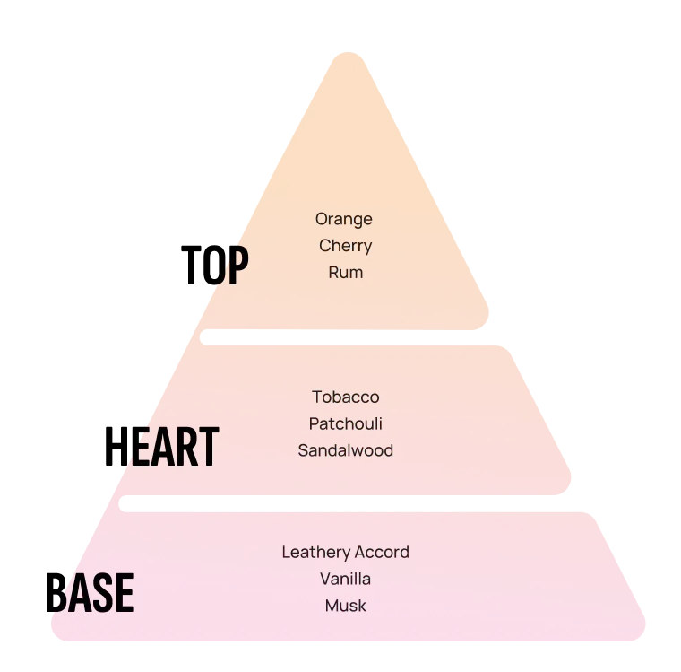 Désodorisant voiture aux notes d’orange, cerise et rhum, cœur chaud de patchouli et santal, sur un fond cuiré adouci de vanille et musc.